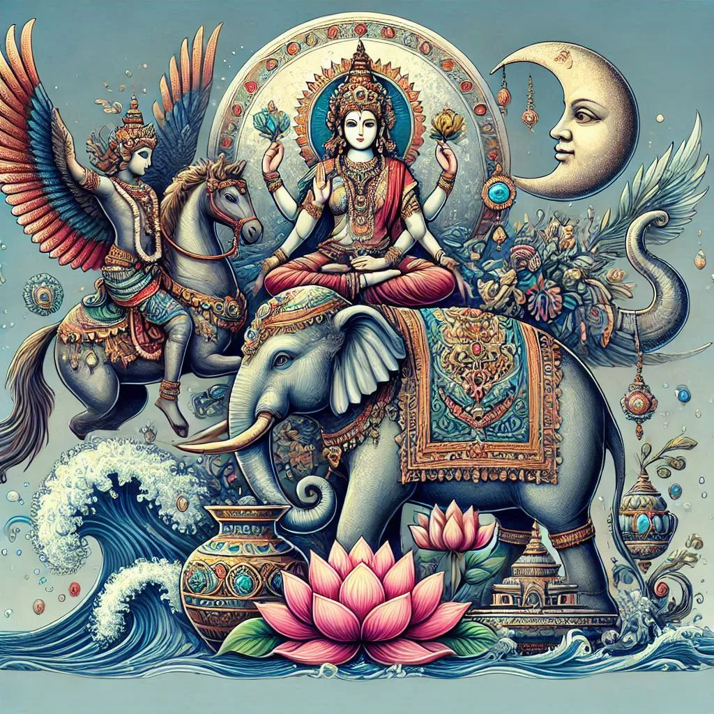 Notes: The following emerged from the milk ocean at the churning:Chandradev, Surabhi and other cows, Kalpavriksha, Kaustubha mani, Ucchaisravas, Airavata, Wine and intoxicants, Maa Lakshmi