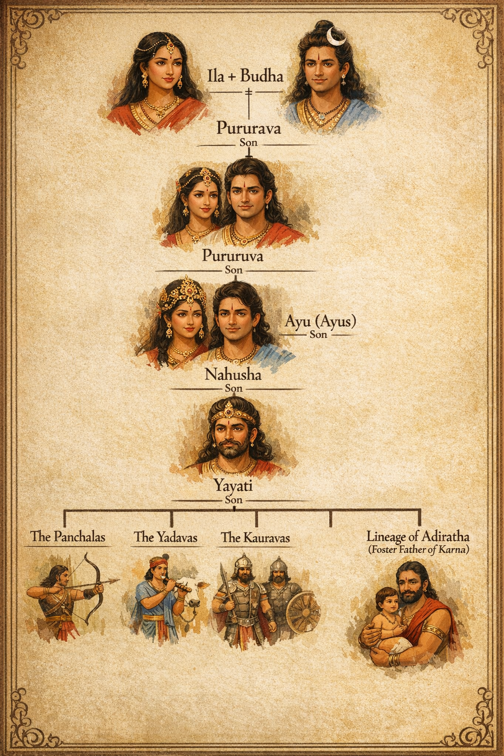 Ila was both man and woman alternately and she gave birth to Pururava through Budha, the son of Chandra. This is where the Chandravamsha officially begins.